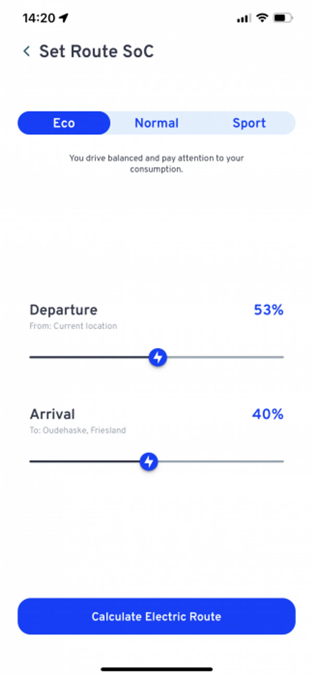 Via het beginscherm kun je meteen een route instellen. Ik stel de route in vanaf Eelde naar Oudehaske. Vervolgens moet ik in het volgende scherm aangeven wat mijn rijstijl is. Rijd ik zuinig en let ik op verbruik dan kies ik ‘eco’, ben ik hier niet mee bezig en rijd ik gebalanceerd dan kies ik ‘normal’. Tot slot kan ik kiezen voor ‘sport’ wat zich het beste omschrijft als een stand voor haast en flink doorrijden. Ook moet ik aangeven op welk batterijpercentage de auto op het moment van vertrek zit en met hoeveel procent ik wil aankomen op plaats van bestemming. Momenteel heb ik een batterijpercentage van 53% en ik wil thuiskomen met batterijpercentage van 40%.
