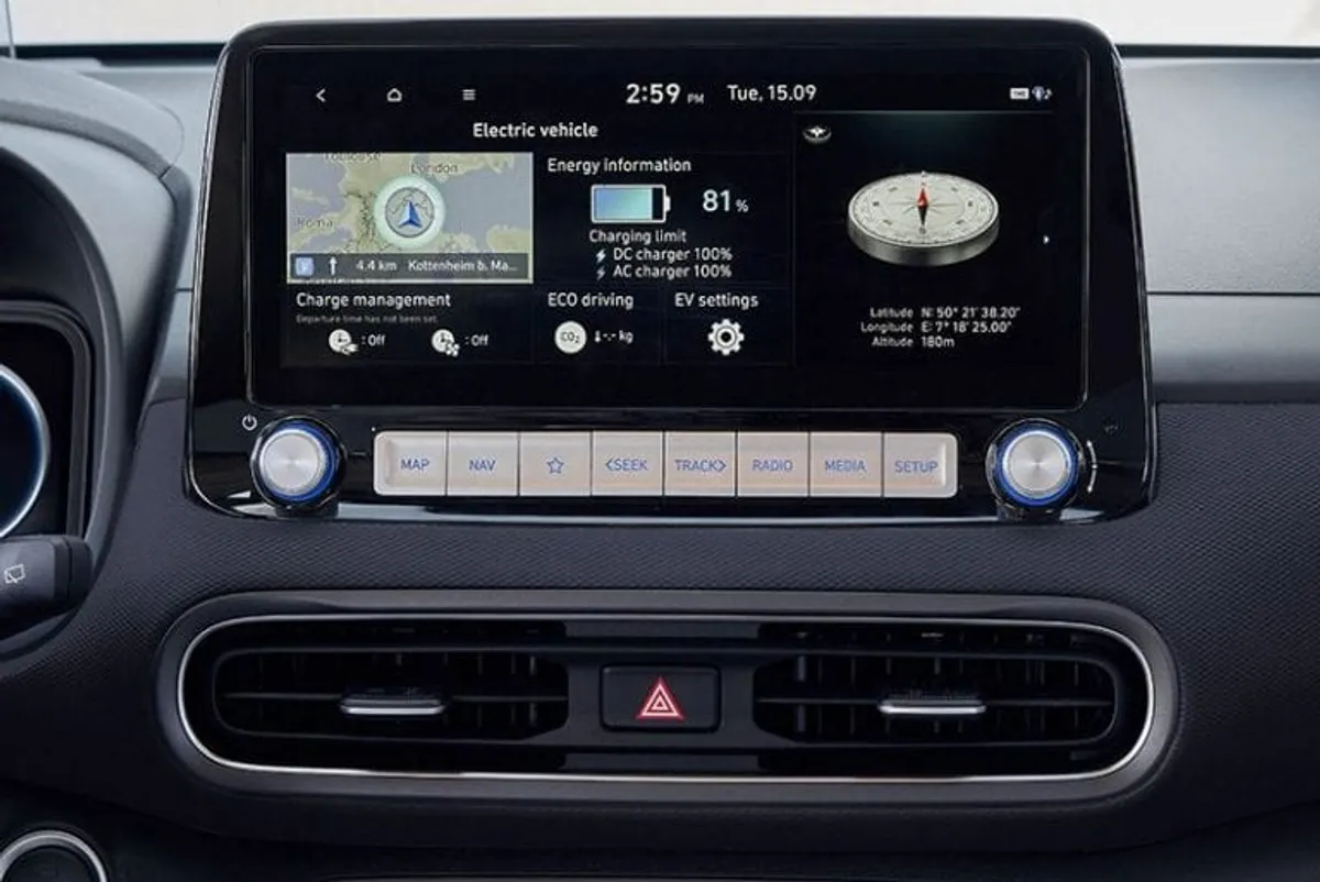 Hyundai geeft aan dat het interieur volledig vernieuwd is. Als we kijken naar de foto, dan valt dit in de praktijk wel iets mee. De auto heeft wél een volledig nieuwe 10,25 inch digitale cockpit met nieuwe connectiviteitsfuncties. Via de Bluelink-app kun je onder andere gemakkelijk de actuele laadstatus bekijken en de auto voorverwarmen. Daarnaast beschikt de auto over Last Mile Navigation en Live Parking Information.